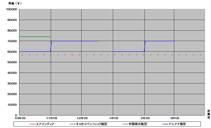 インド、デリー行き航空券が安い時期がわかる便利な相場チャート。2015下期価格推移グラフでいつが安いか確認できます。