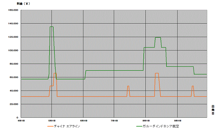インドネシア、デンパサール行き航空券が安い時期がわかる便利な相場チャート。2017上期価格推移グラフでいつが安いか確認できます。