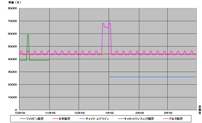 フィリピン、マニラ行き航空券が安い時期がわかる便利な相場チャート。2015下期価格推移グラフでいつが安いか確認できます。