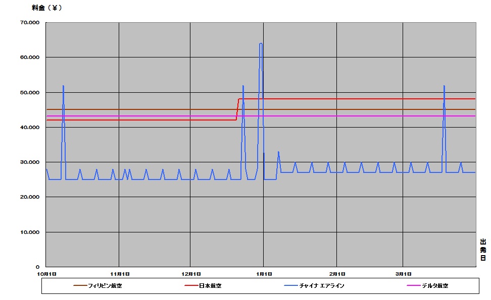 フィリピン、マニラ行き航空券が安い時期がわかる便利な相場チャート。2016下期価格推移グラフでいつが安いか確認できます。