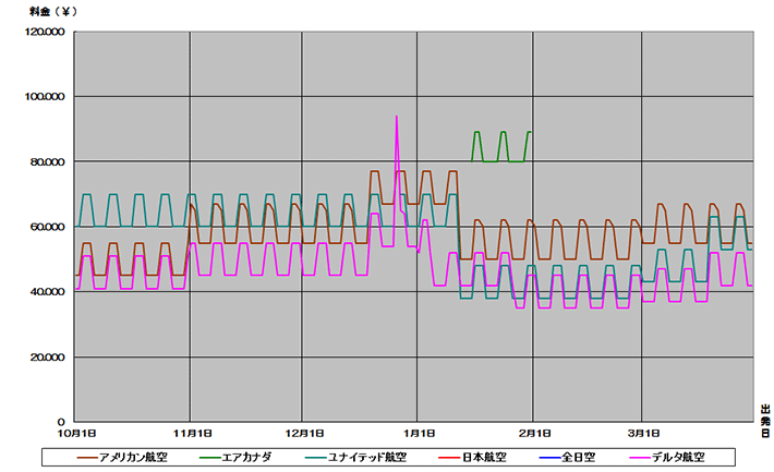 アメリカ、ニューヨーク行き航空券が安い時期がわかる便利な相場チャート。2015下期価格推移グラフでいつが安いか確認できます。