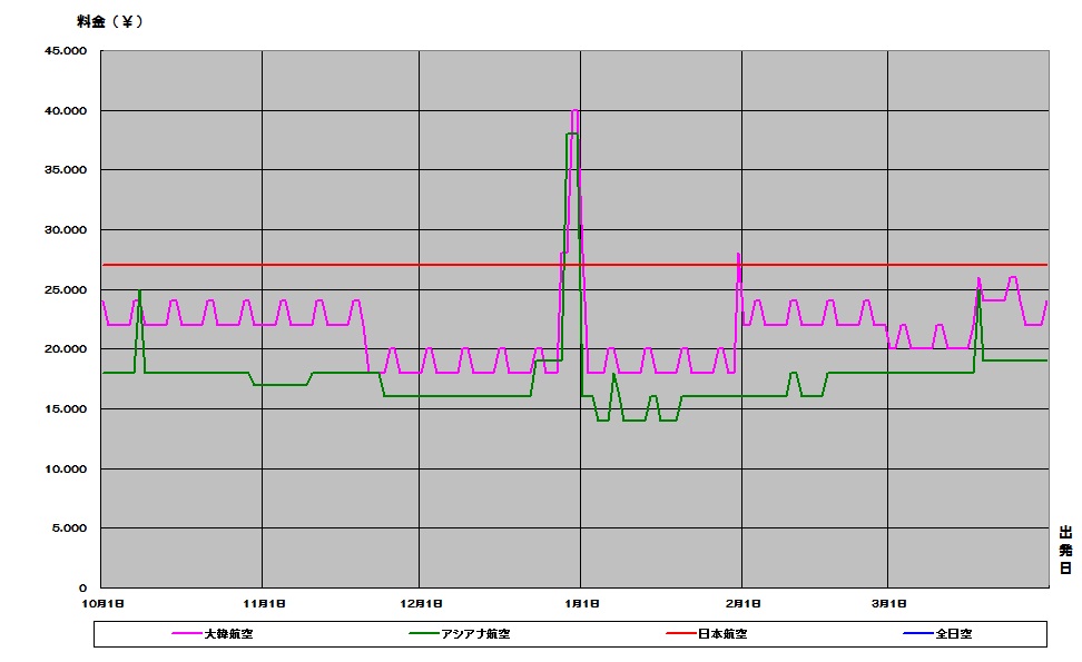 韓国、ソウル行き航空券が安い時期がわかる便利な相場チャート。2016下期価格推移グラフでいつが安いか確認できます。